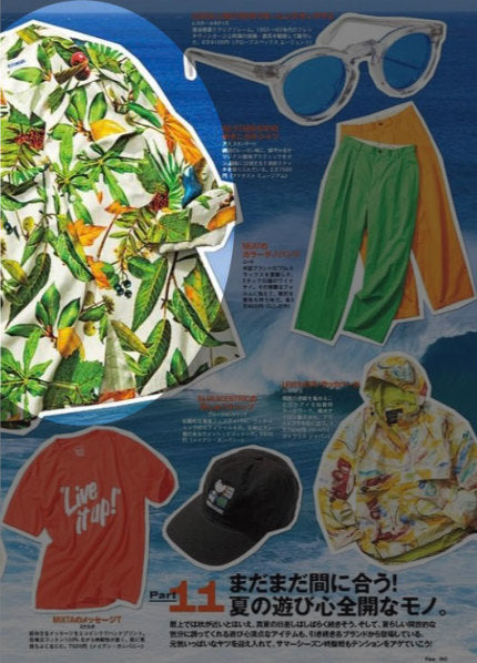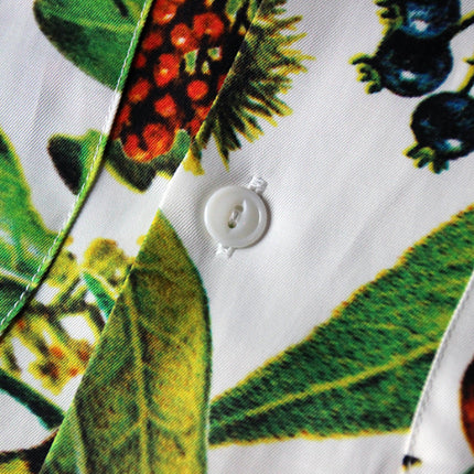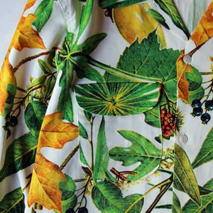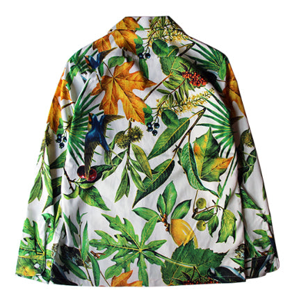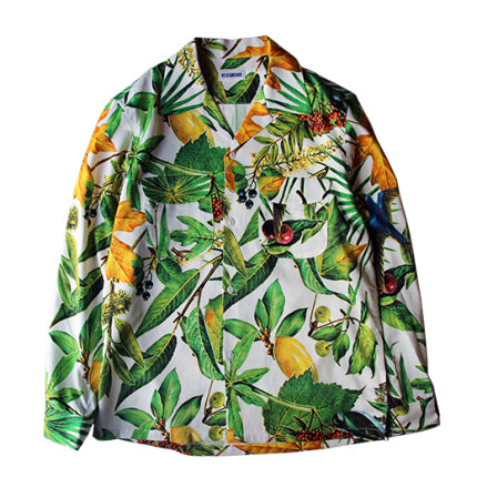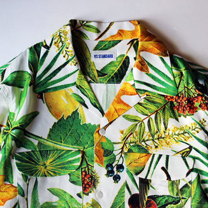 This is an all-over pattern shirt in the shape of an open-collar shirt seen in the 50s and 60s, printed with the brand's original graphics of various plants and animals.