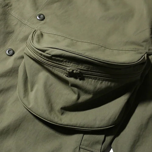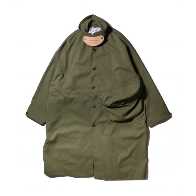 A wide military coat featuring large, asymmetrical pouches that stand out.