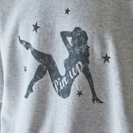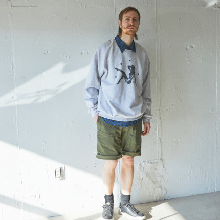 擦れのピンナッププリントを落とし込んだスエット、袖丈は首元からの採寸となります。