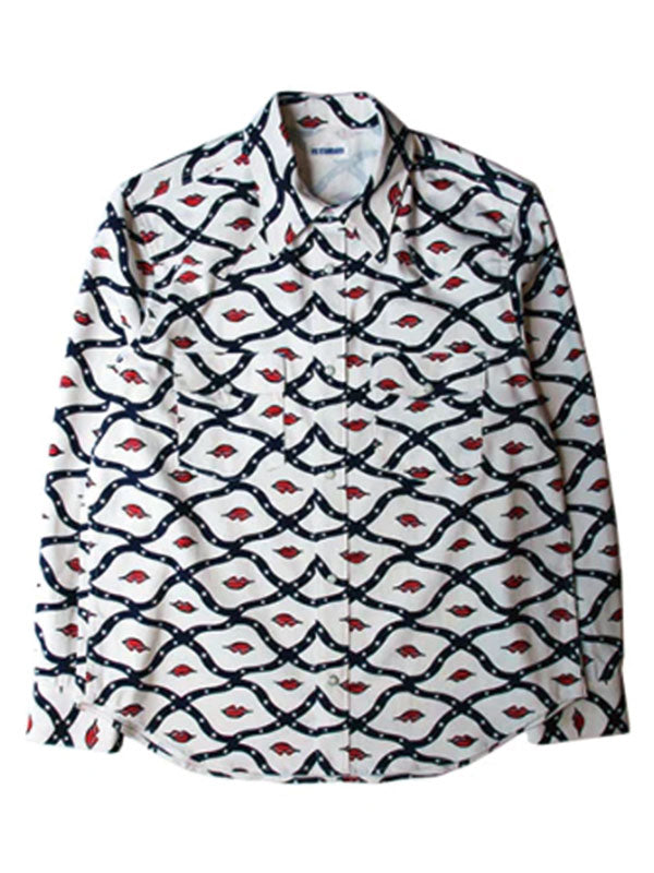 ウェスタンシャツの形にブランドオリジナルグラフィックをのせた総柄シャツ。