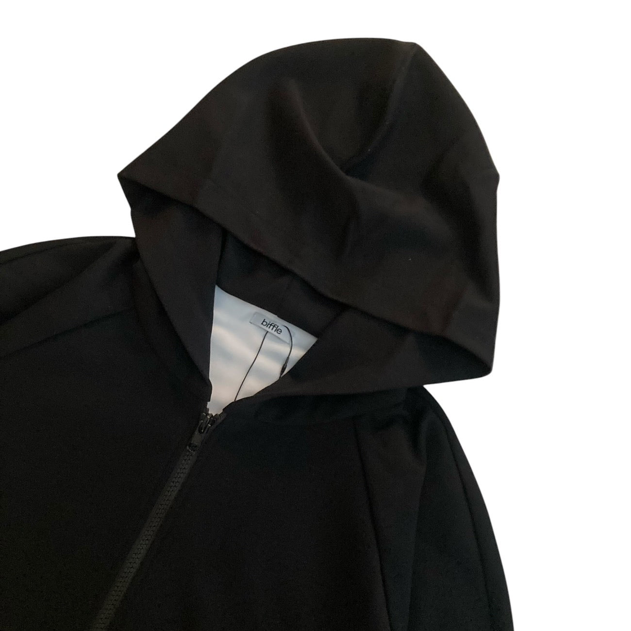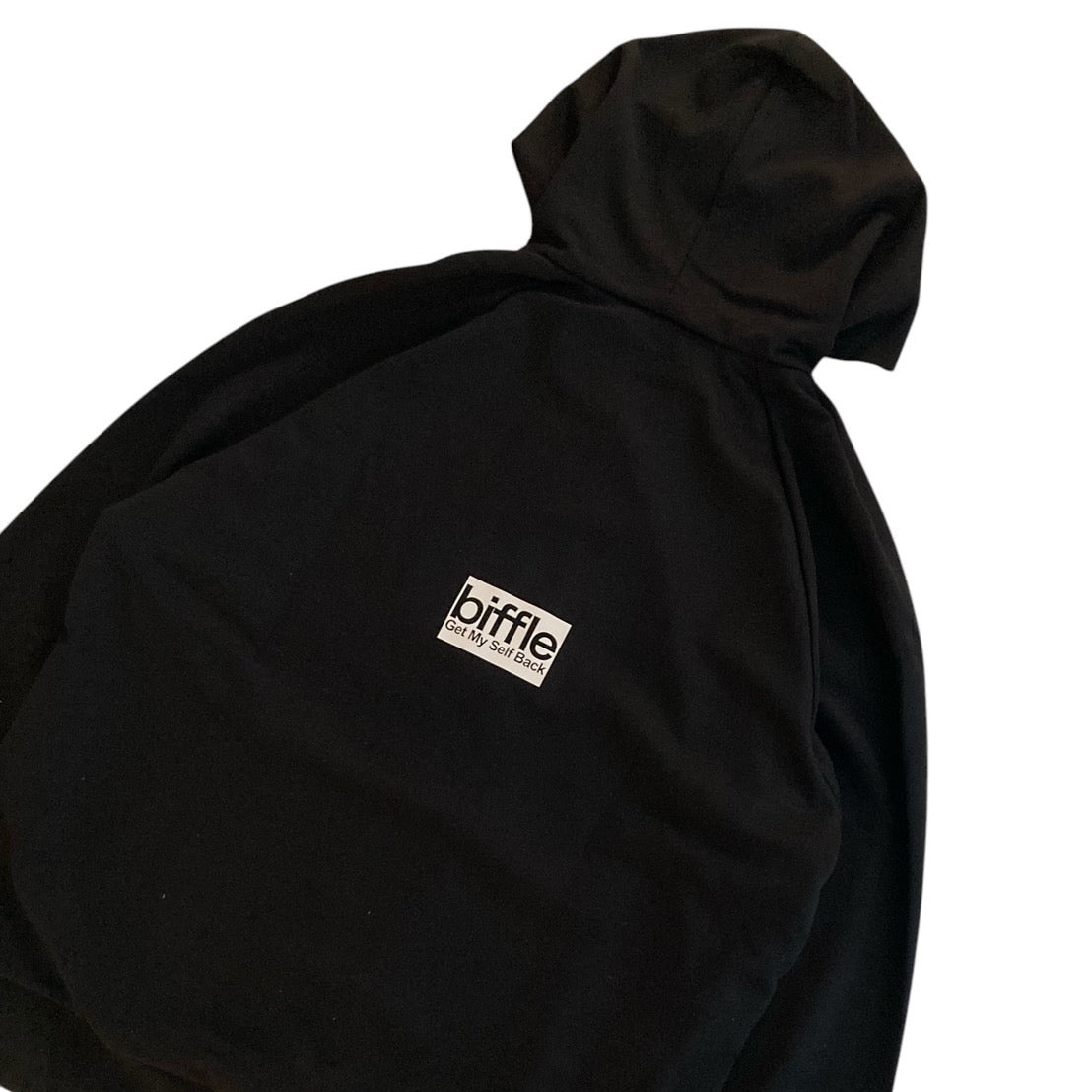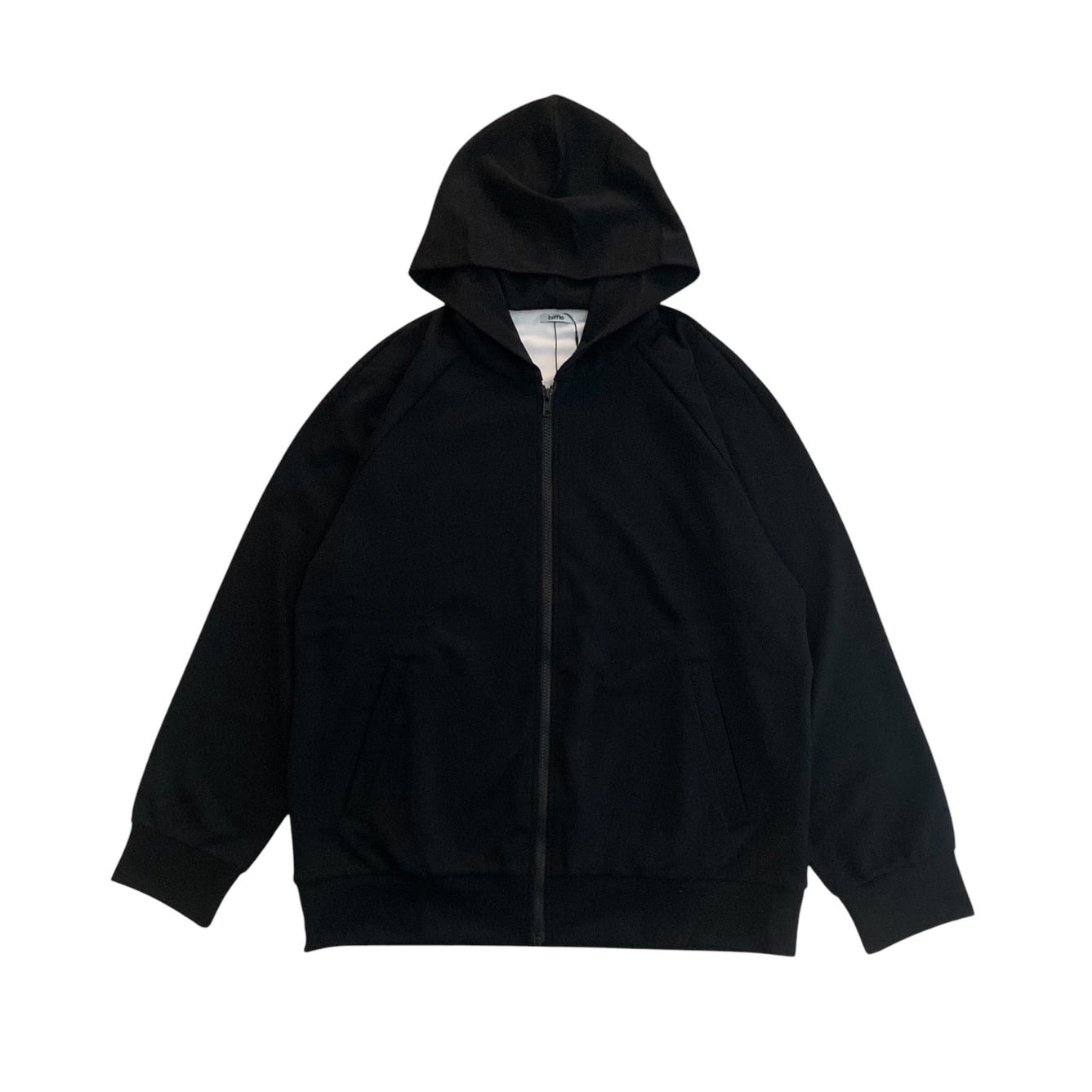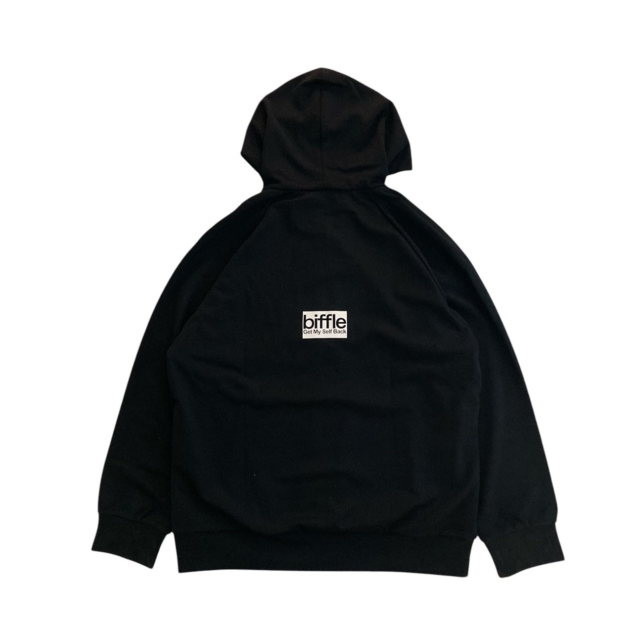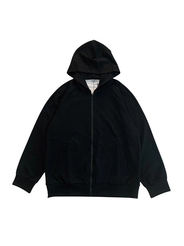 背中に凹凸のロゴプリントを施したジップパーカーです。