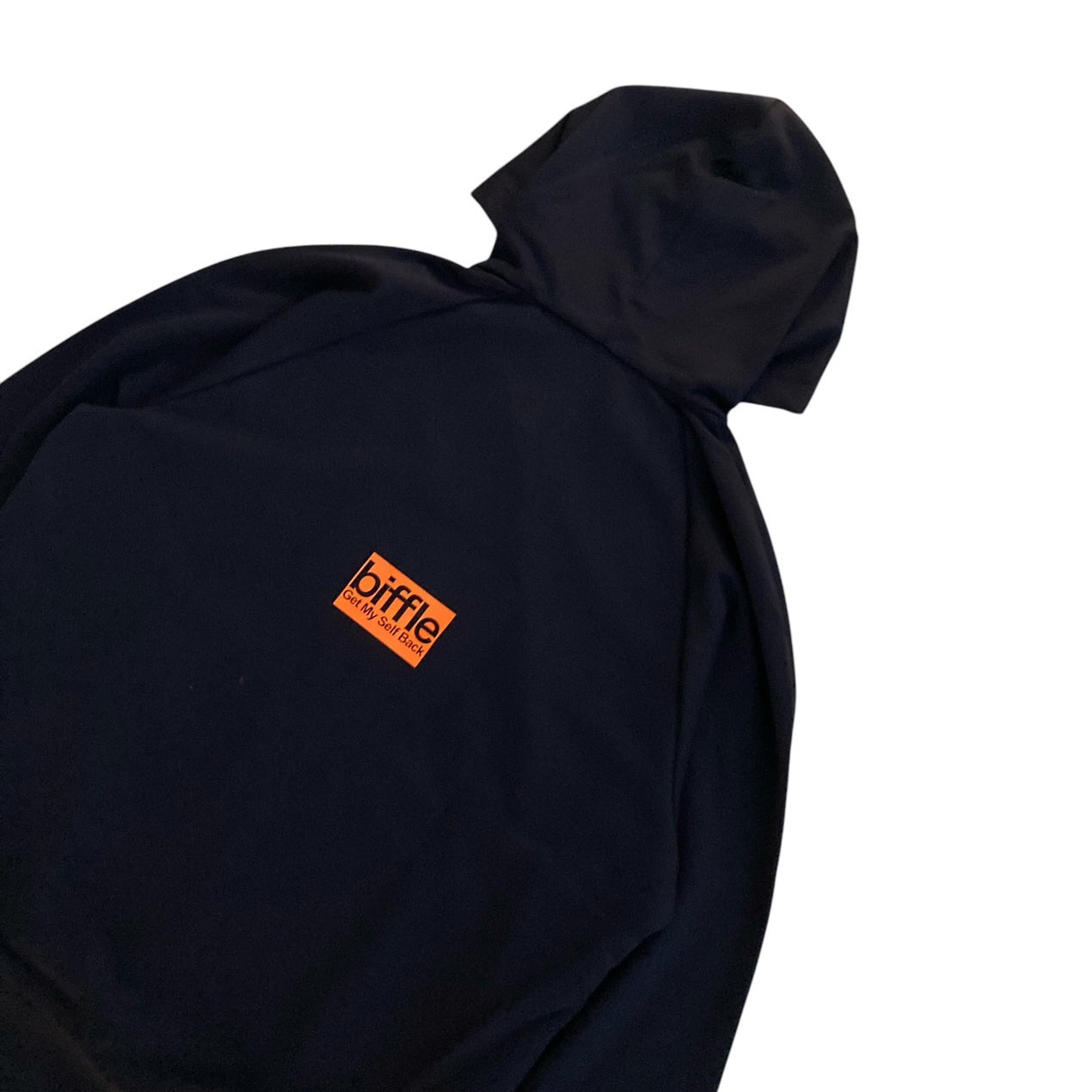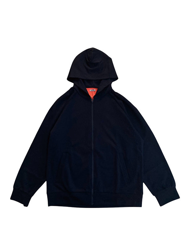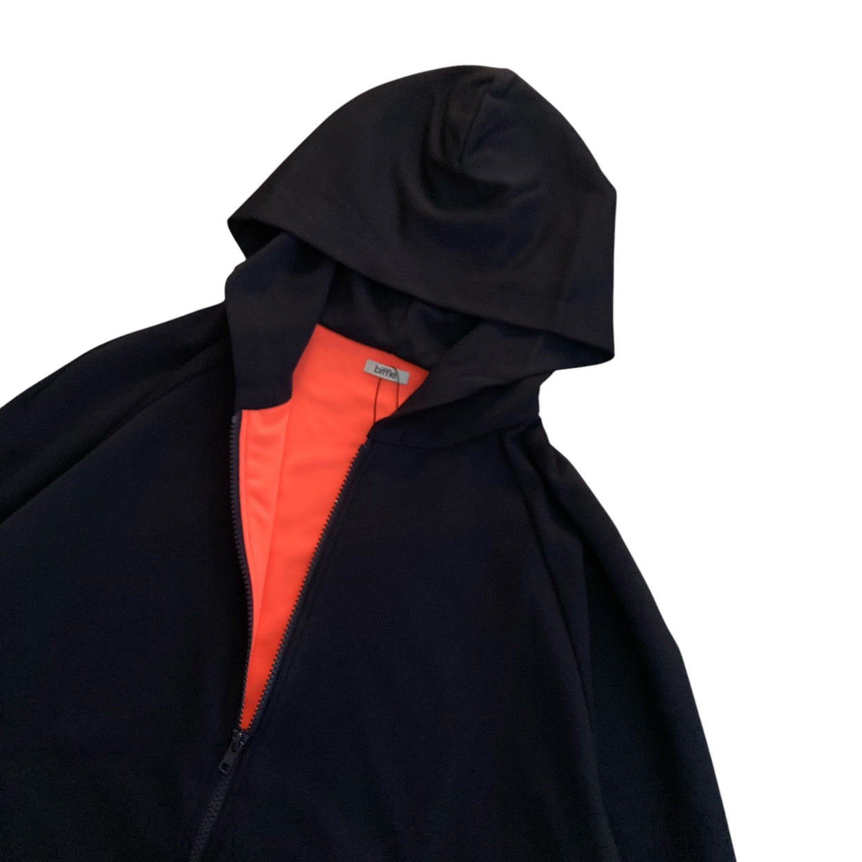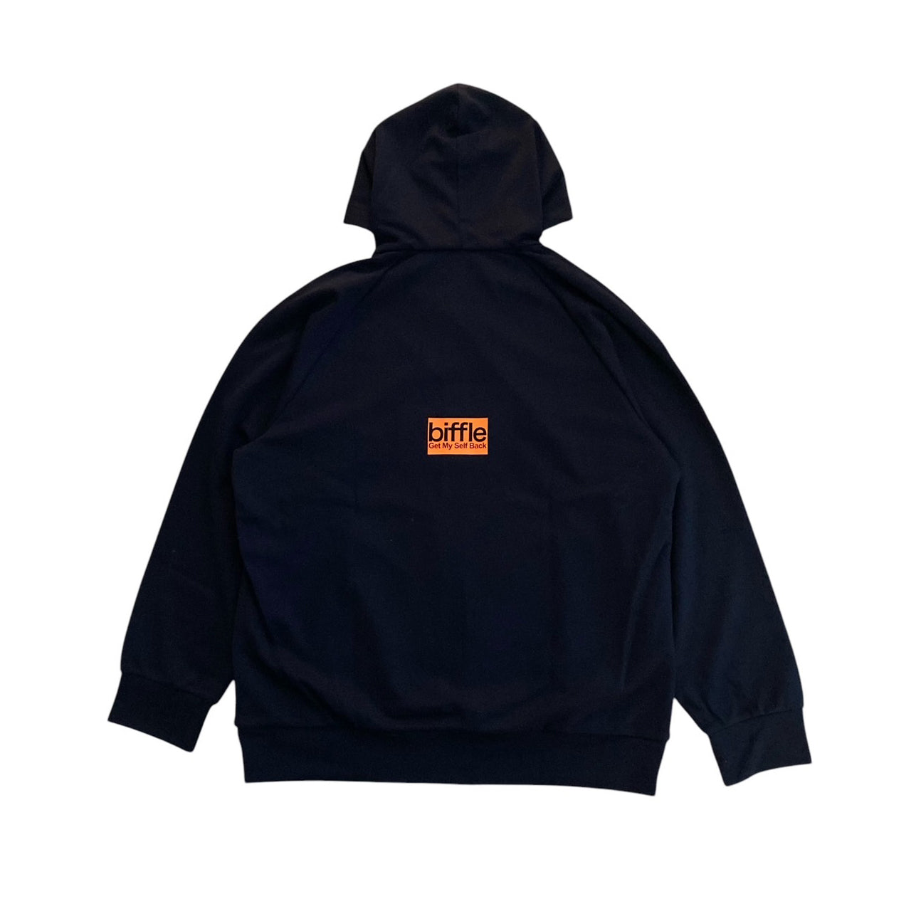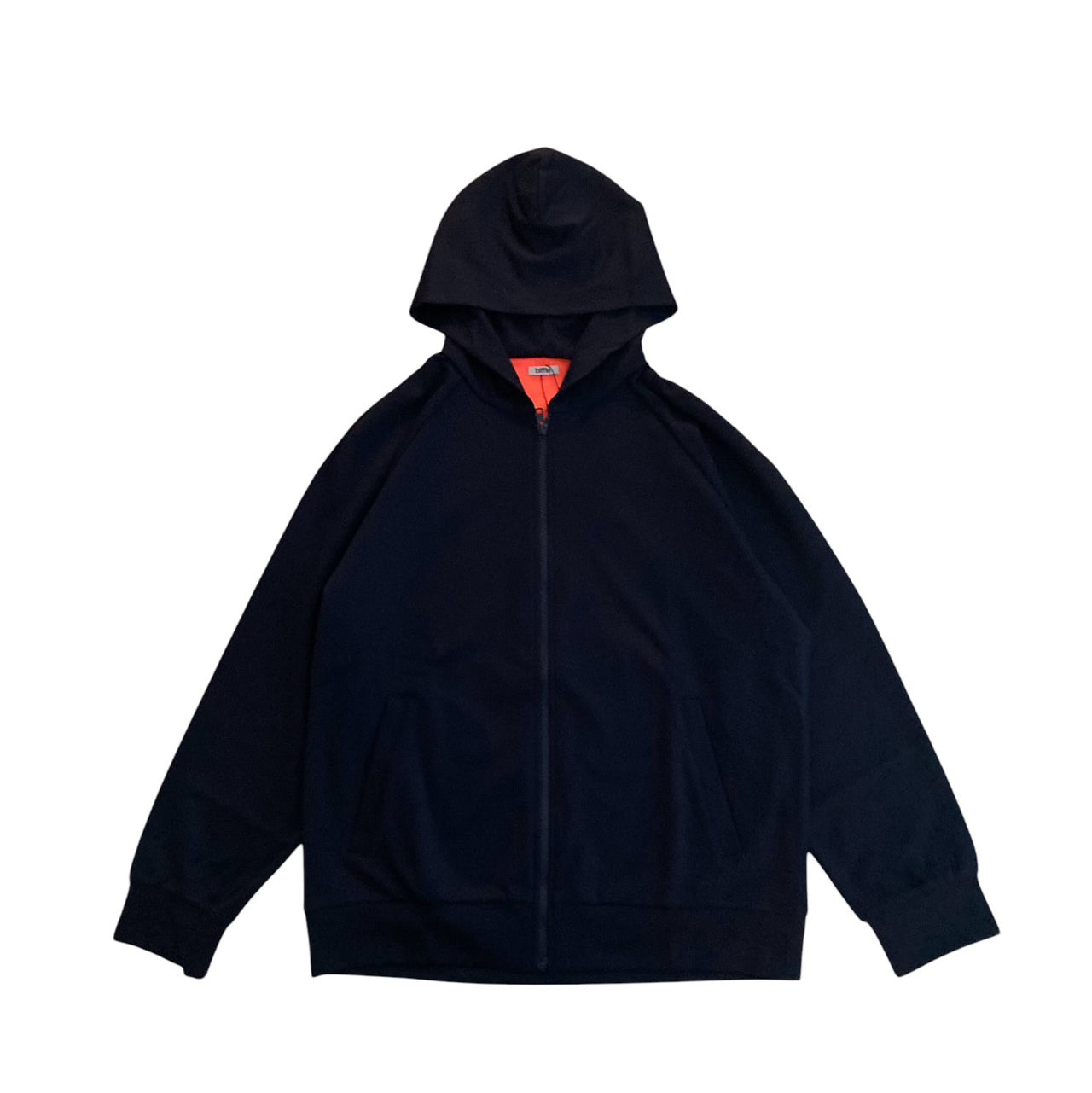 背中に凹凸のロゴプリントを施したジップパーカーです。