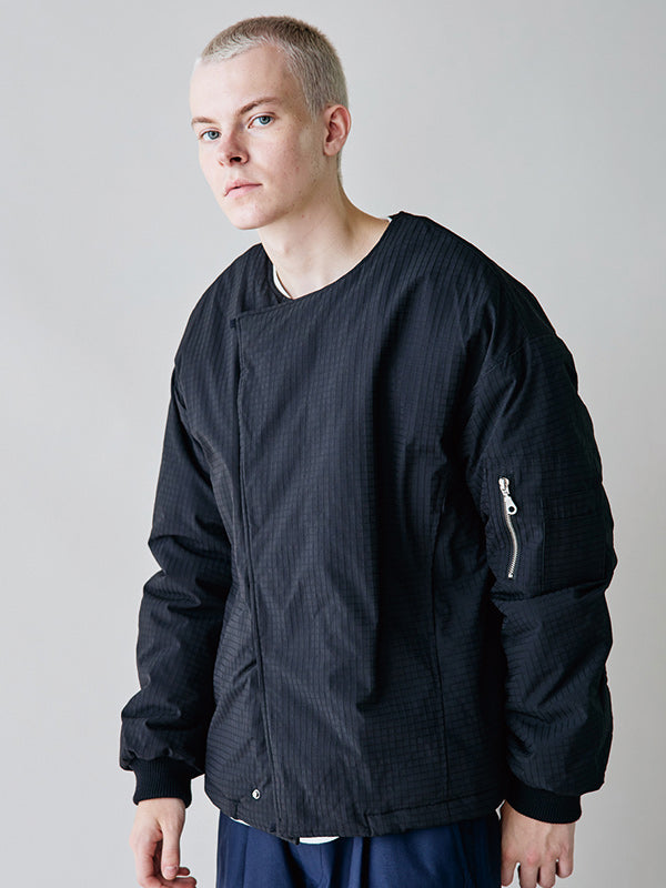 ミリタリーデザインをベースに、ライダースジャケットの要素を融合させた中綿入りジャケットです。
