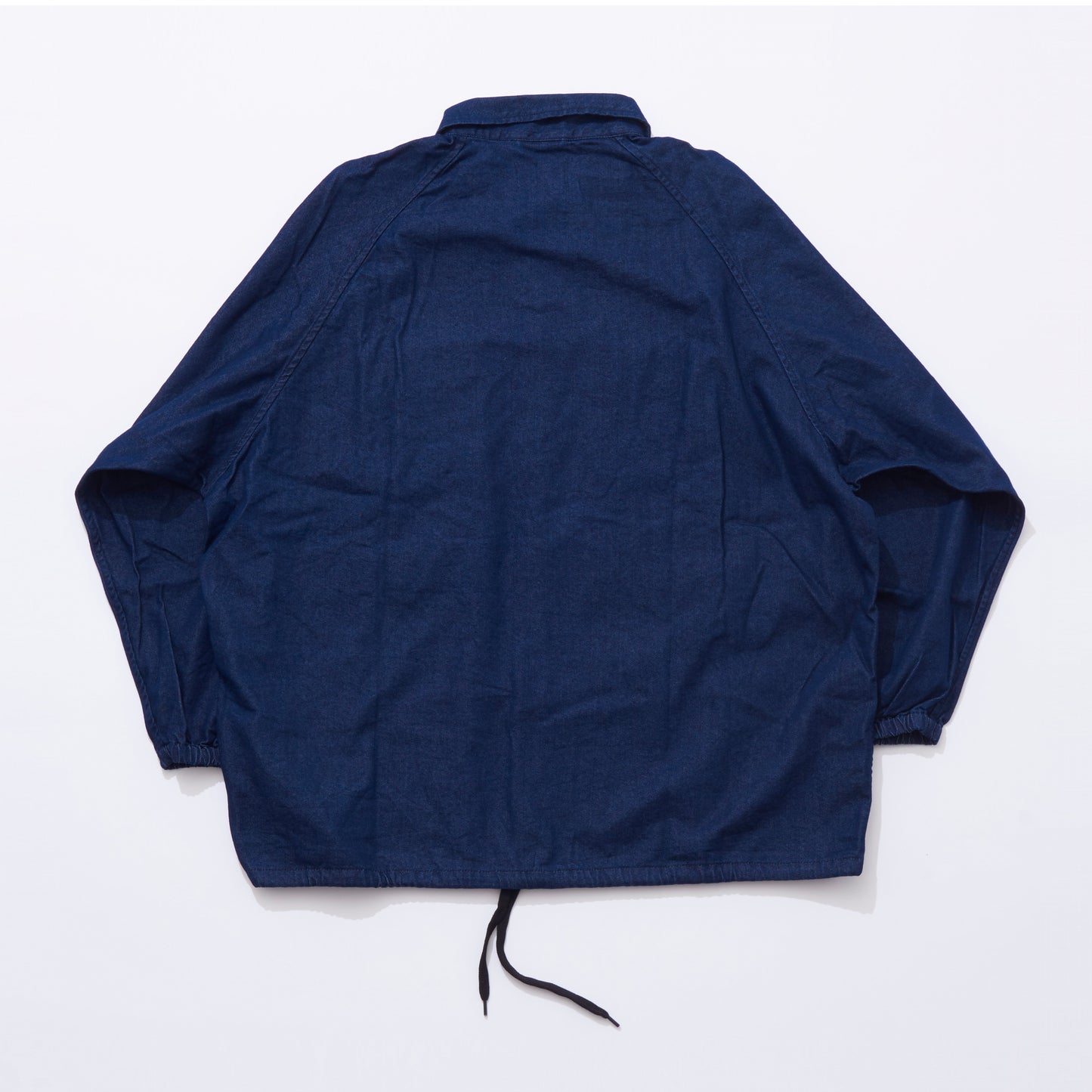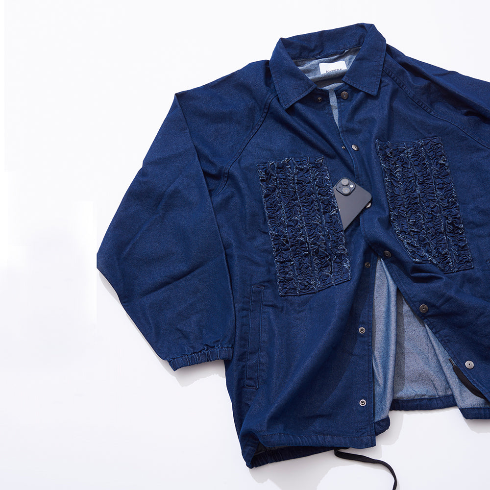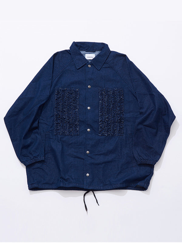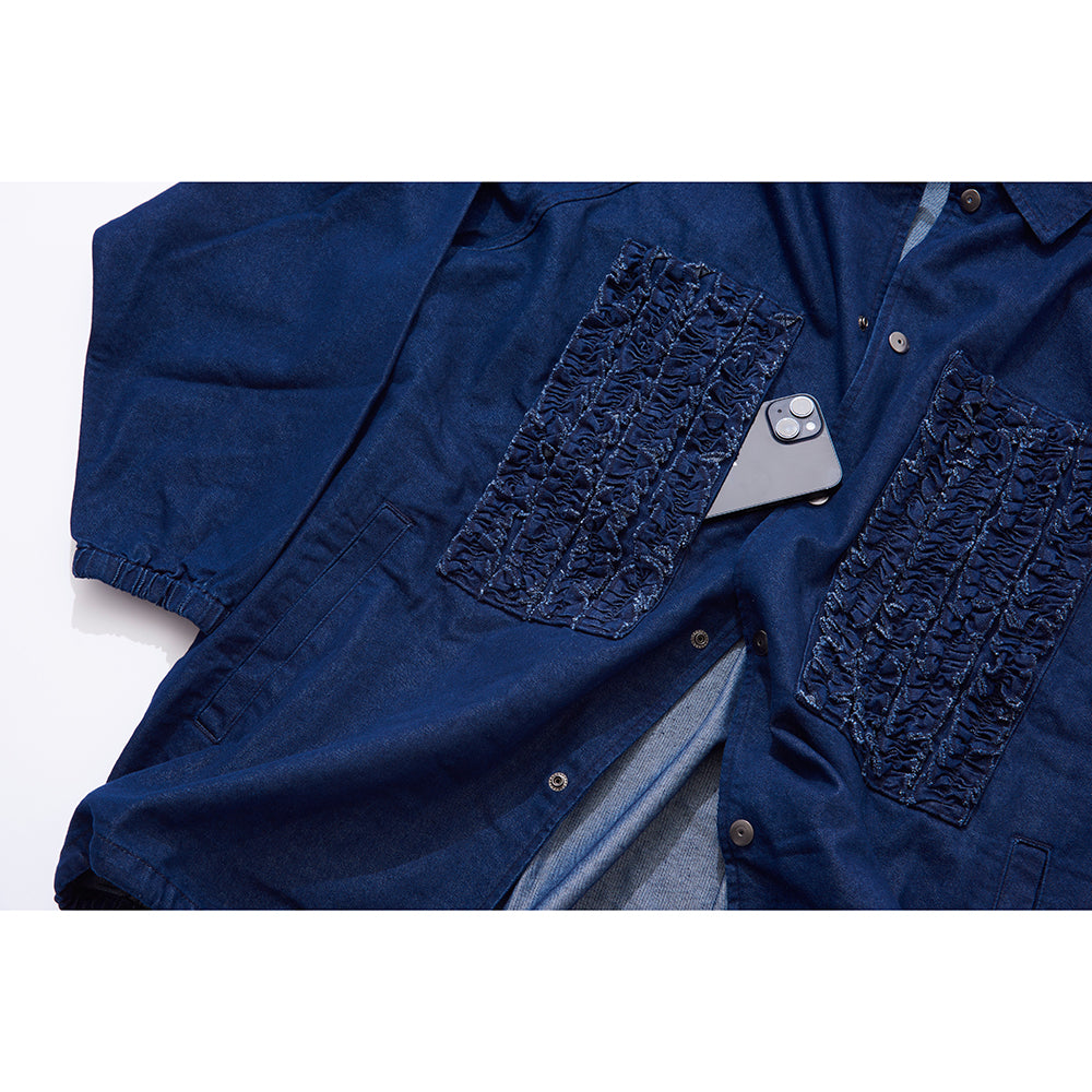 8ozデニム生地を使用したオーバーサイズコーチJKT。 ワークシャツの胸ポケットをフリル状にすることでドレス要素を取り入れたストリートなアイテム。