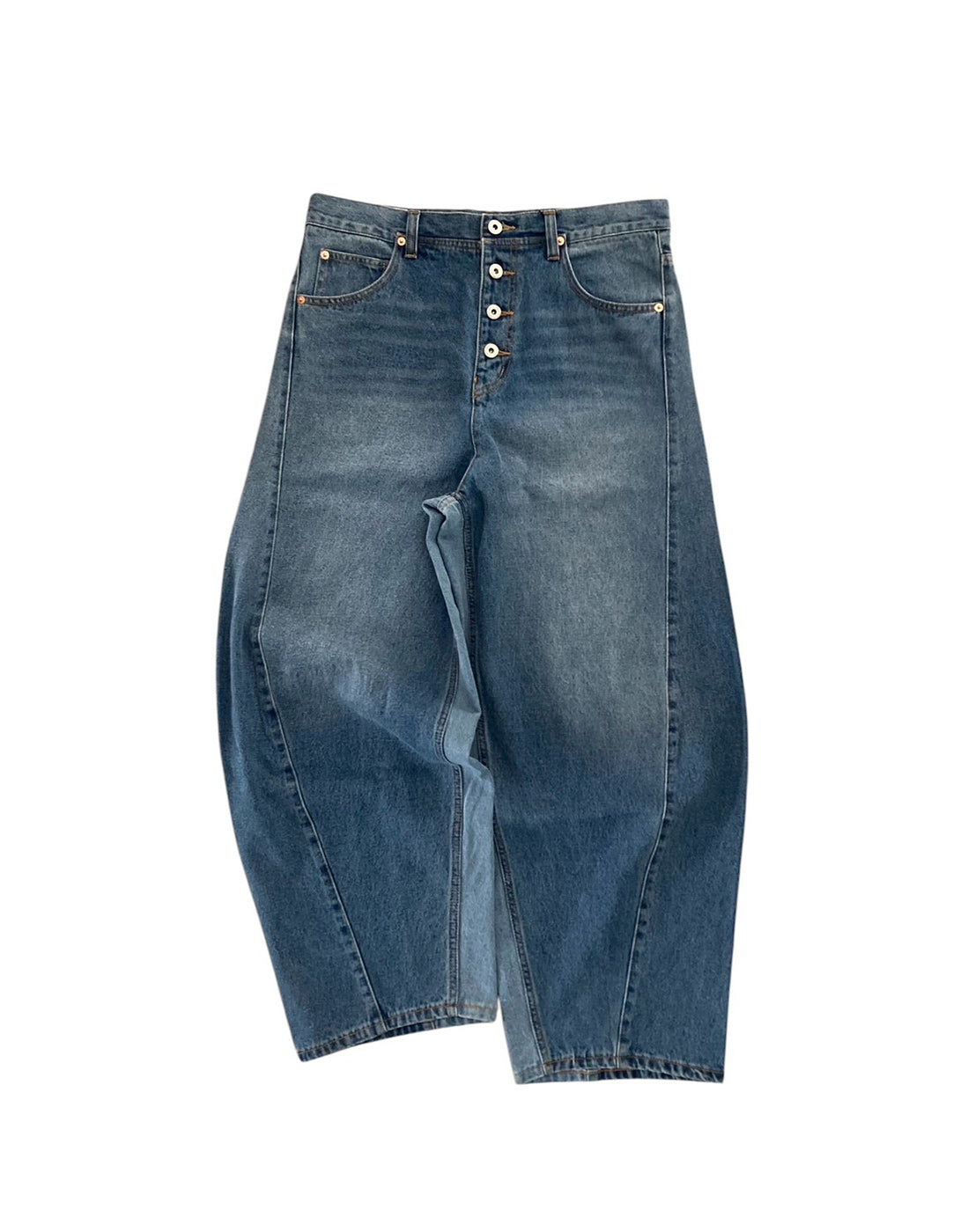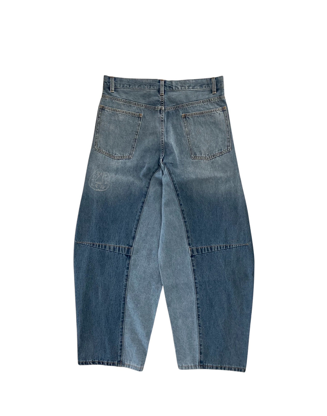 サイドの切り替えを裾にかけて内側に入れ込み、膝裏にダーツを入れることでより立体的に仕上げた3Dバレルレッグシルエット。内股をさりげなく配色加工にする事でより立体的に仕上げました。